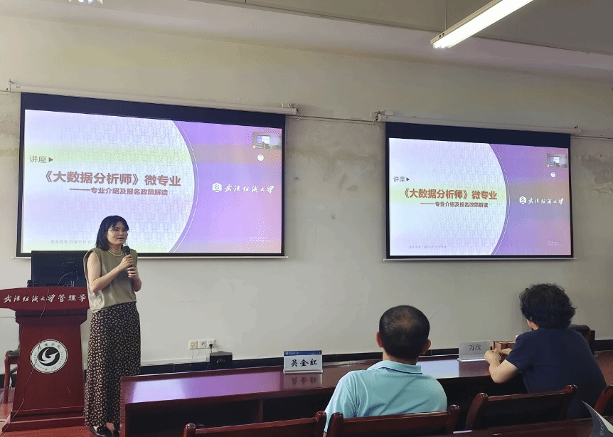 张文芬老师为台下师生解读报名政策。详细介绍了该微专业的课程设置,课程涵盖了数据挖掘、数据分析、机器学习等多方面内容,旨在为员工提供全面系统的大数据分析知识和技能培训。同时,还强调了该微专业的特色之一:零基础学习。这意味着即使员工没有相关背景知识,也能够通过系统的学习获得必要的技能,并且在课程实践中不断提升。