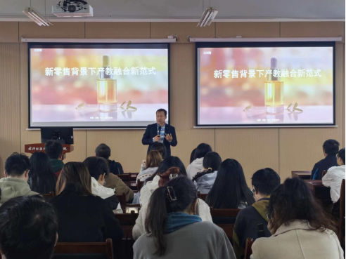 漆贤军从“新零售业态演进”与“数字技术驱动下的产业变革”切入,系统阐述了新零售如何重构“人、货、场”关系,并进一步提出产教融合需从“单向输出”转向“生态共建”。他结合广东数字经济与产业融合创新实践案例,指出高校应在课程设计、科研合作与竞赛体系中主动嵌入产业真实问题,构建“以赛促学、以创促融”的协同育人机制。