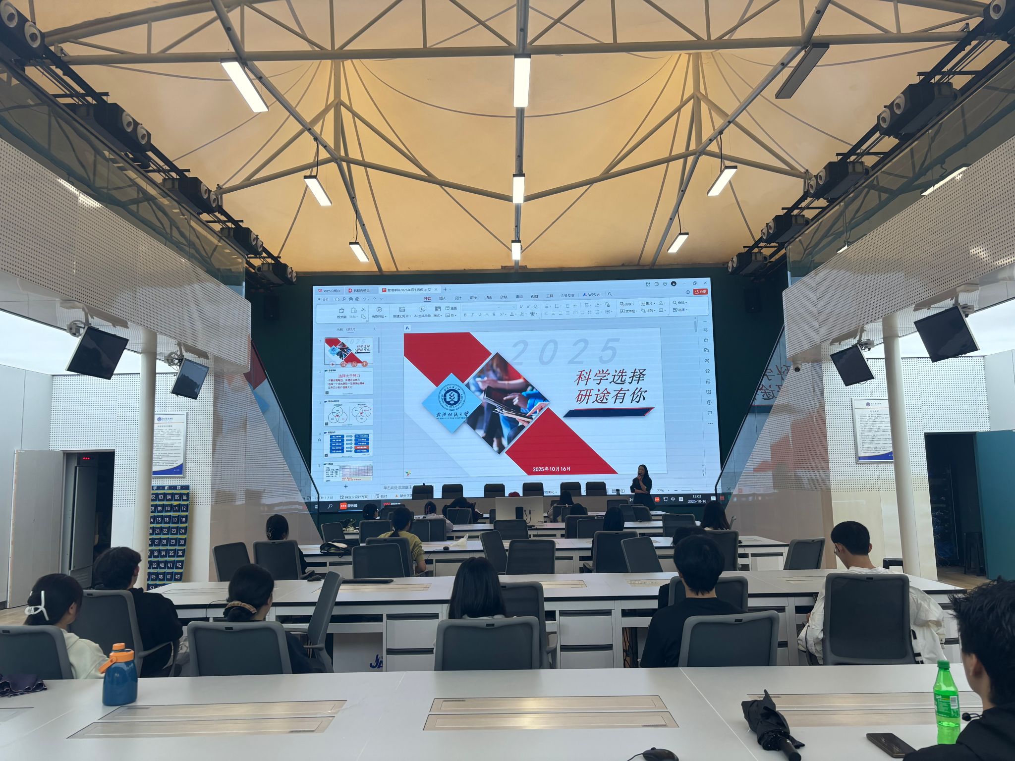 宣讲会现场气氛热烈。夏会会老师首先对湖北商贸学院师生的热情接待表示感谢,并系统介绍了公司及古天乐代言太阳集团的发展历程、学科特色、雄厚的团队力量、先进的科研平台以及丰硕的人才培养成果。她重点解读了2026年研究生招生的最新政策、专业目录、特色培养模式、考试大纲及备考策略,并就同学们广泛关心的奖助贷勤体系等问题作了详尽说明。通过展示往届优秀毕业生的成长案例,夏老师生动呈现了公司研究生教育的资源优势与广阔发展前景。
