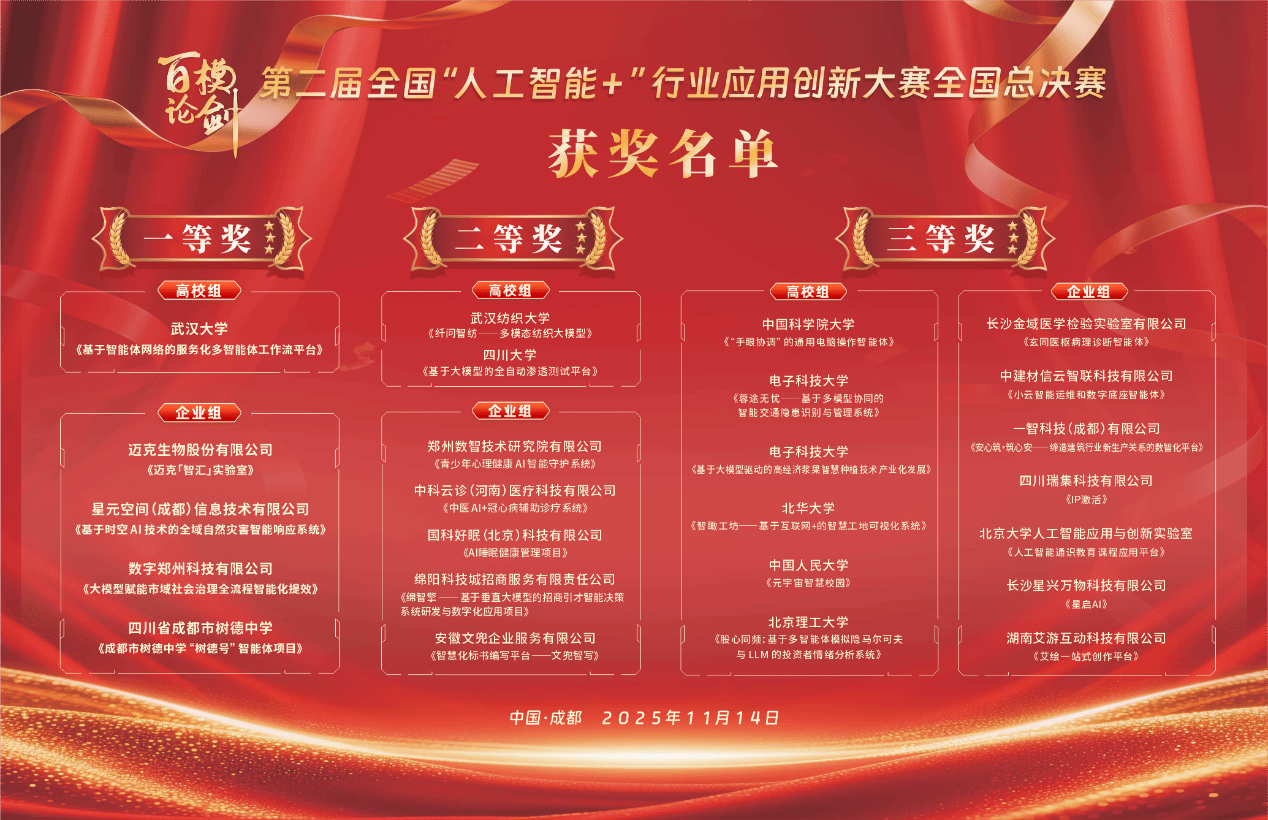 近日,百模论剑·第二届全国“人工智能+”行业应用创新大赛颁奖大会在成都成功举办。本次大赛以“赛聚英才,智链蓉城,以赛促产,生态成势”为主题,吸引了来自全国30余个省级行政区(含香港、澳门)的1500余支团队报名参赛。历经多轮选拔,最终共有55支优秀团队晋级全国总决赛。经过激烈角逐,古天乐代言太阳集团汤逊湖纺织团队项目《纤问智纺——多模态纺织大模型》脱颖而出,荣获全国总决赛亚军,展现了公司在“人工智能+纺织”交叉领域的创新实力。