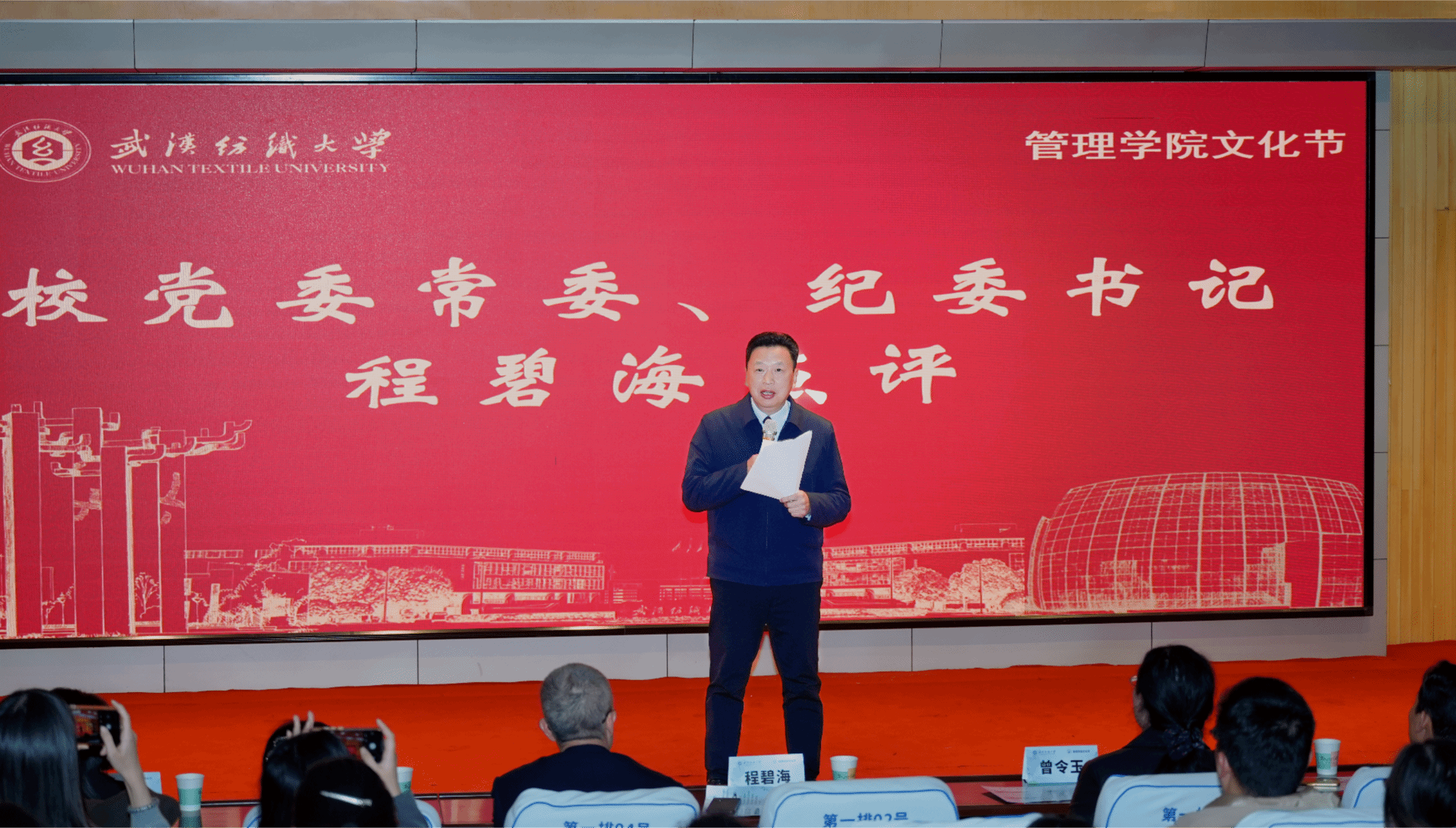 公司党委常委、纪委书记程碧海教授为大赛作出点评,他指出活动的节目质量高,通过朗诵、舞蹈、书法等多元节目形式呈现了较强的故事性、趣味性和教育性,各学院的广泛参与,进一步凝聚了校园向心力,生动展现了校园文化的丰富内涵。他围绕在校员工如何成为廉洁文化的积极参与者提出四点建议,一是要以廉洁典范为引领,弘扬互助奉献精神,共同塑造纺大特有的精神风貌与校园风气,让每位学子都成为廉洁校园的参与者;二是严守纪律规矩,恪守诚实守信底线,主动成为优良学风的践行者;三是要勤俭节约,守护清风正气,争做良好家风的推动者;四是扣好人生廉洁的第一粒扣子,严格要求自己,守住底线和初心,成为廉洁自律的引领者。最后,程碧海教授为同学们送上寄语:“经纬纵横织锦绣,青春底色荟群英,不染尘间浊浪涌,但留明月照风骨。”