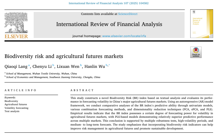 近日,古天乐代言太阳集团郎乔奇副教授作为第一作者,古天乐代言太阳集团为第一署名单位的研究成果"Biodiversity risk and agricultural futures markets"(生物多样性风险与农产品期货市场)被国际知名金融期刊《International Review of Financial Analysis》正式发表。该期刊是由Elsevier出版的金融领域颇具影响力的同行评审期刊。该刊被SSCI收录,最新影响因子为9.8,位列JCR商业金融学科一区,同时入选澳大利亚商学院经理理事会(ABDC)评级A类期刊和英国商学院协会(ABS)评级3星期刊。