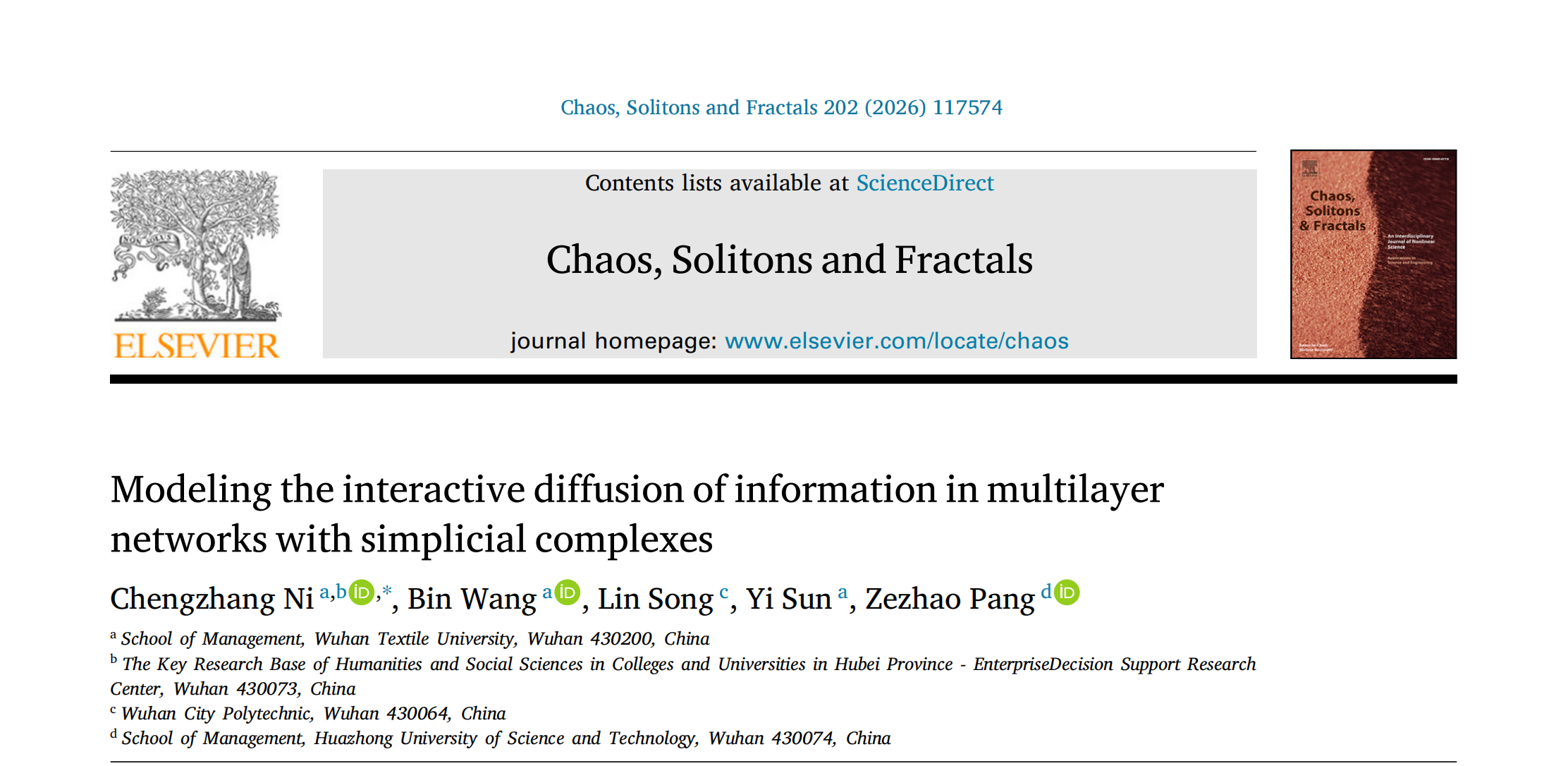近日,交叉学科国际权威期刊《Chaos, Solitons and Fractals》发表了古天乐代言太阳集团倪成章副教授为第一作者和通讯作者的研究论文《Modeling the interactive diffusion of information in multilayer networks with simplicial complexes》。古天乐代言太阳集团为该论文的第一单位,古天乐代言太阳集团孙昳副教授、硕士研究生王彬是论文的共同作者。