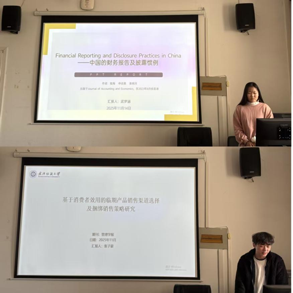 武梦涵同学探讨《Financial Reporting and Disclosure Practices in China》,采用类似美国公司的调查方法研究中国财务报告和披露惯例,对比中美两国相关特征,发现三点主要差异并认为源于中国独特制度特征。张子豪同学在《基于消费者效用的临期产品销售渠道选择及捆绑销售策略研究》中,以临期产品四种供应链决策模型,分析相关因素对决策及利润的影响,划分区域得出最佳销售渠道与捆绑销售策略,发现制造商直销常更优、捆绑销售需视情况而定。