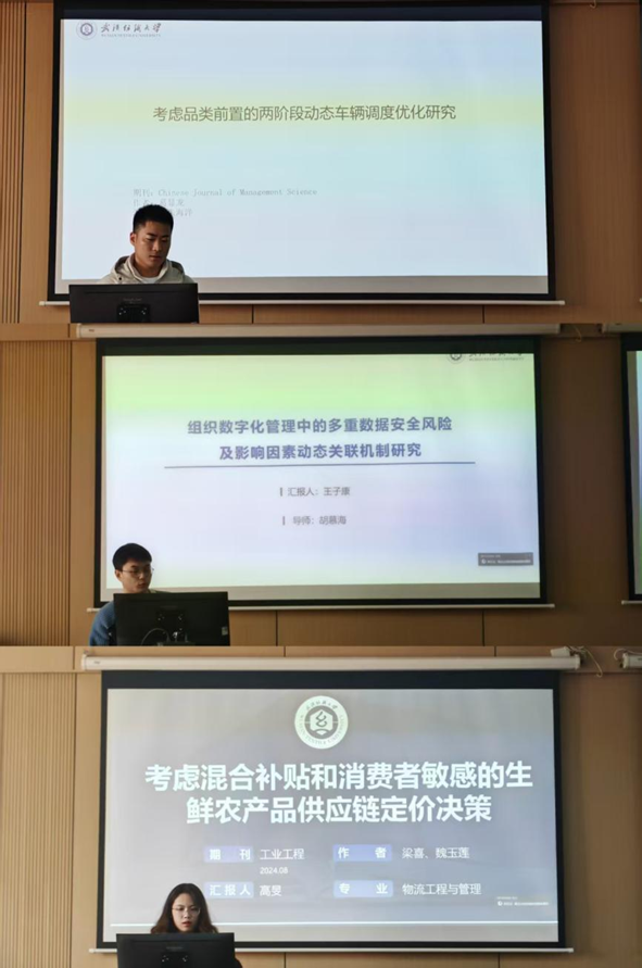 分会场7-513教室,首先朱海洋同学以《考虑品类前置的两阶段动态车辆调度优化研究》为题,提出前置仓两级配送模式,研究顾客具有多种商品品类需求特性的动态配送问题。王子康同学汇报了论文《组织数字化管理中的多重数据安全风险及影响因素动态关联机制研究》,论文聚焦组织数字化管理场景,探究多重数据安全风险的核心影响因素。高旻同学带来了《考虑混合补贴和消费者敏感的生鲜农产品供应链定价决策》的论文分享,通过Stackelberg博弈分析三种补贴模式的影响,得出多种有利于供应链成员利润、社会福利等的结论。